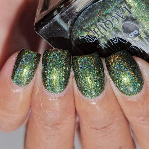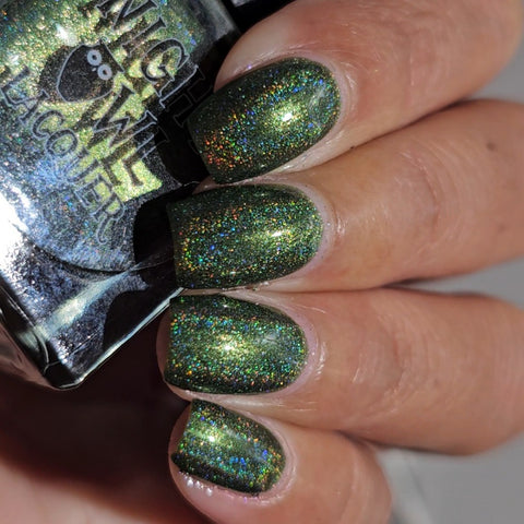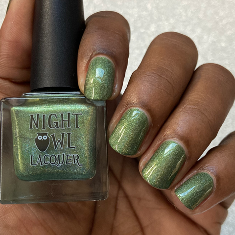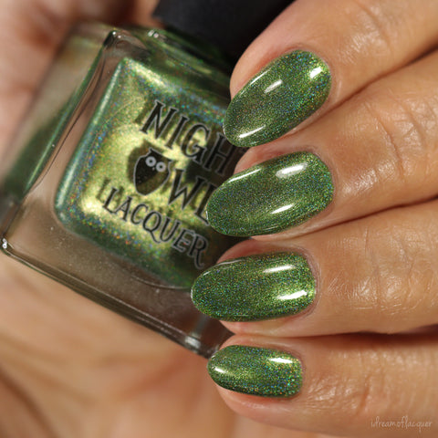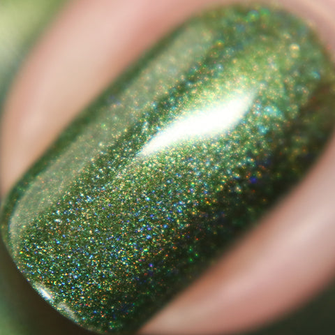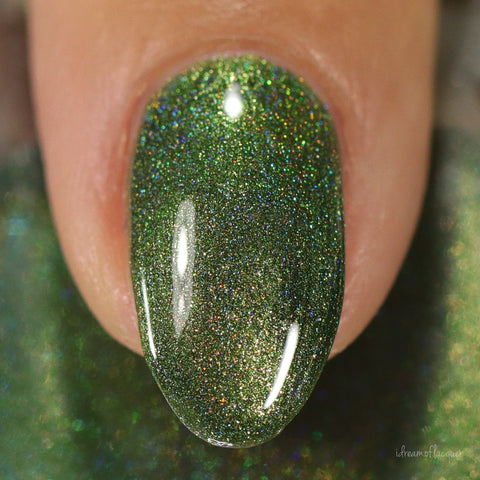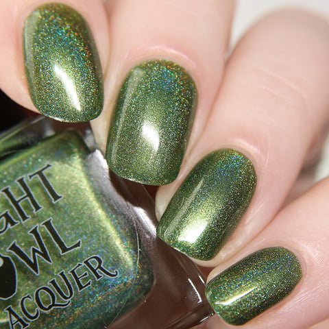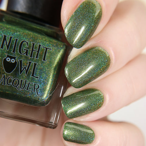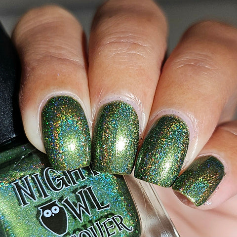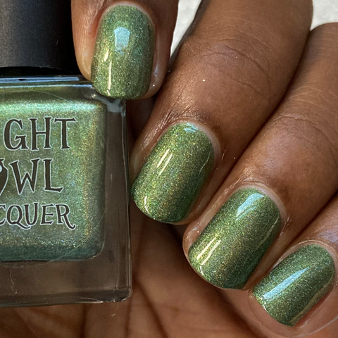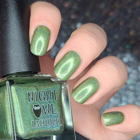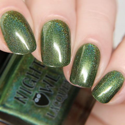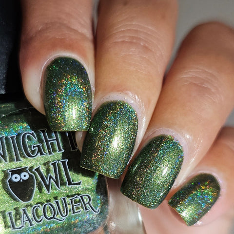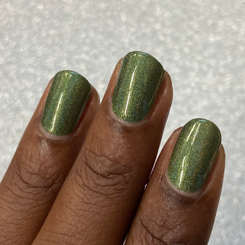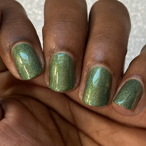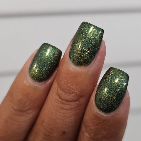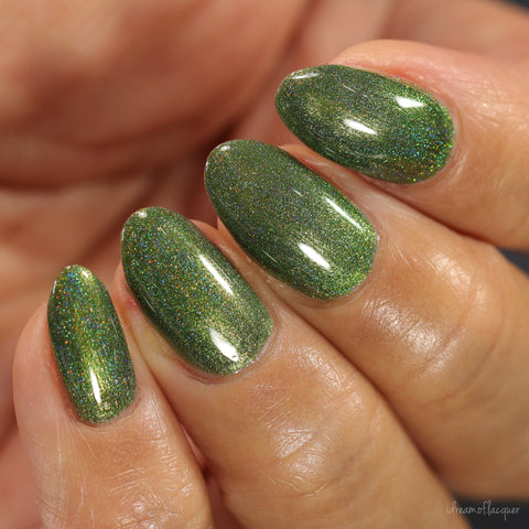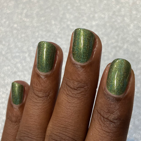 This is a linear holographic forest green with a subtle pearly green shimmer.