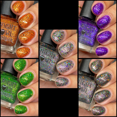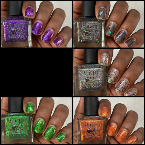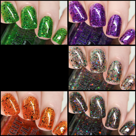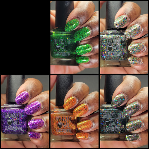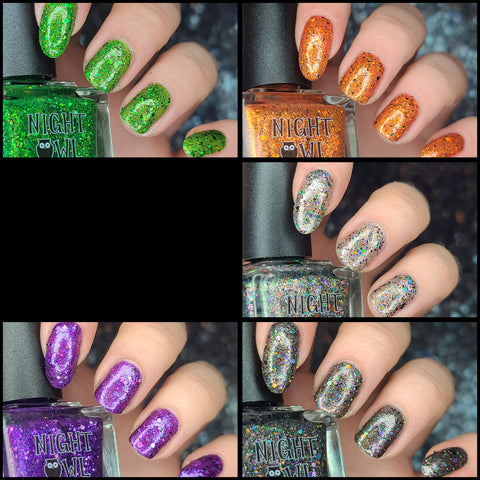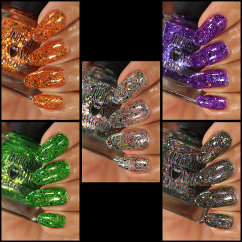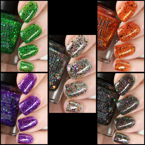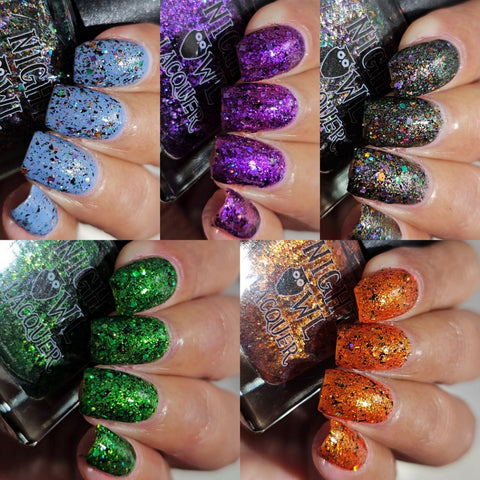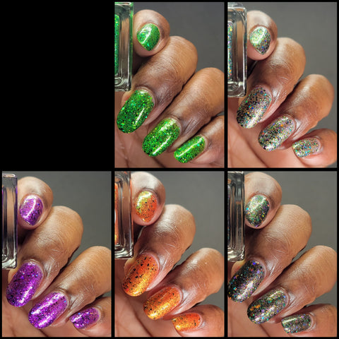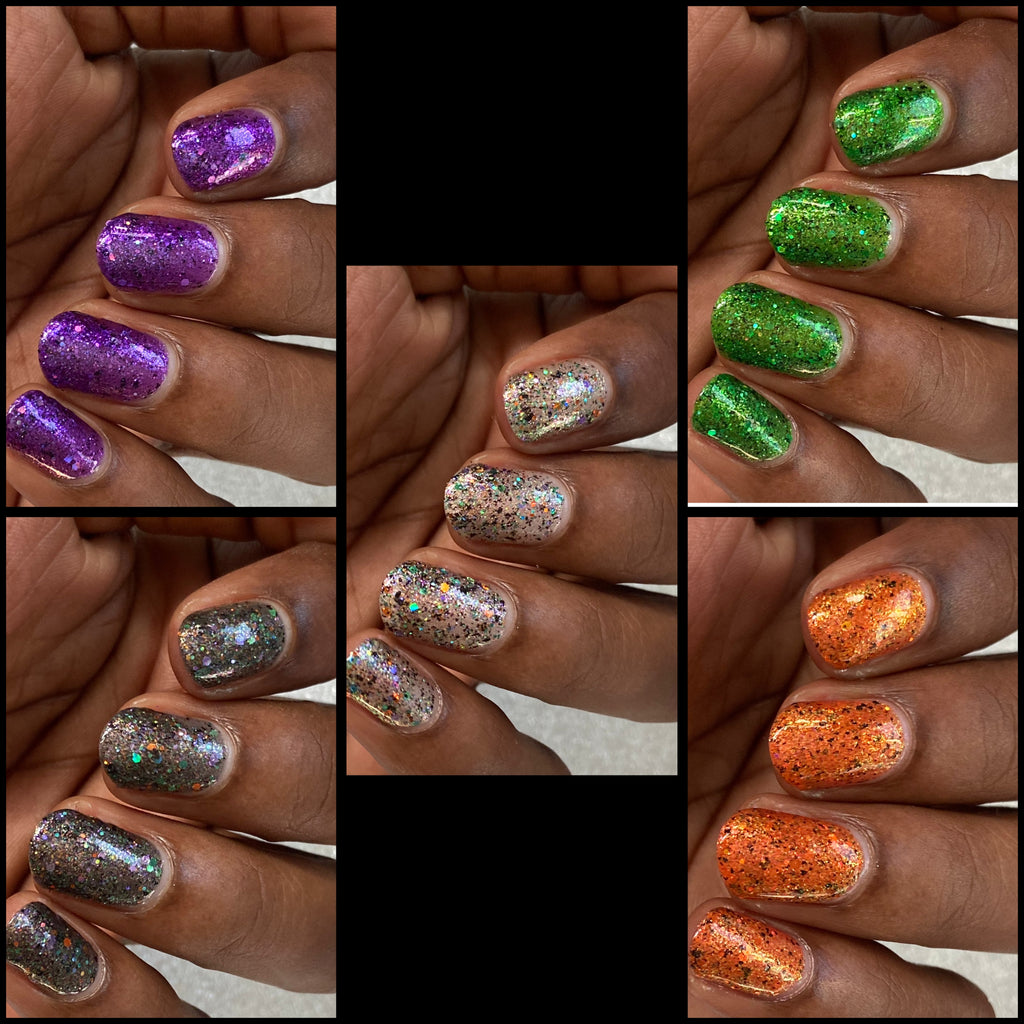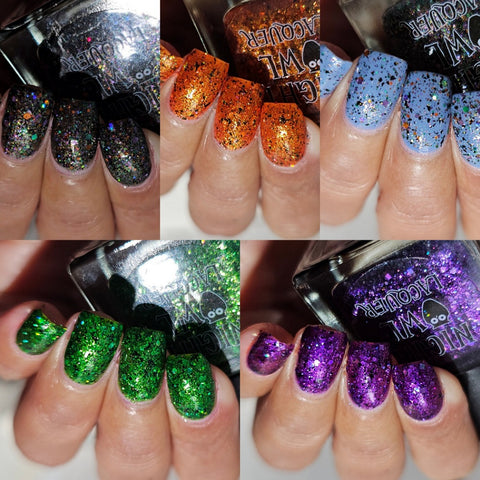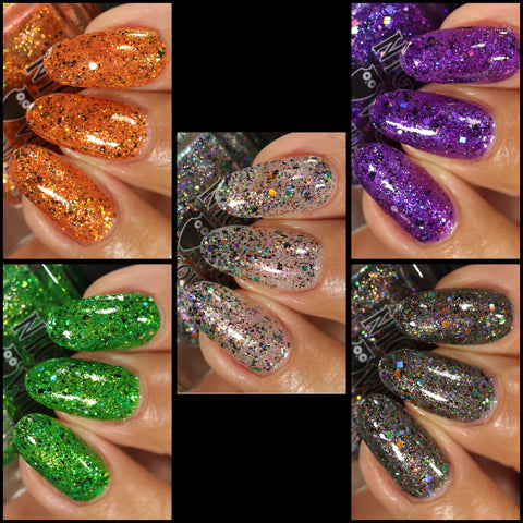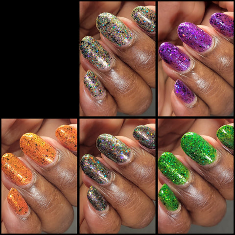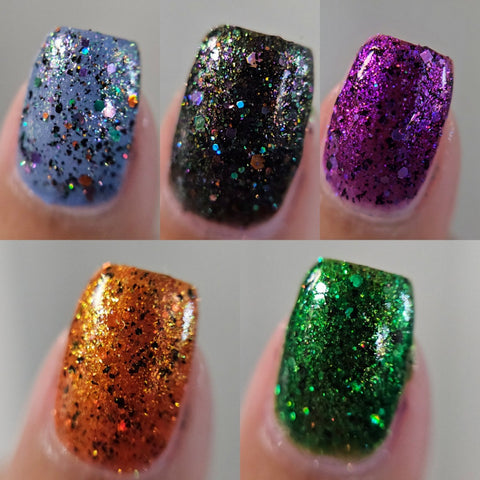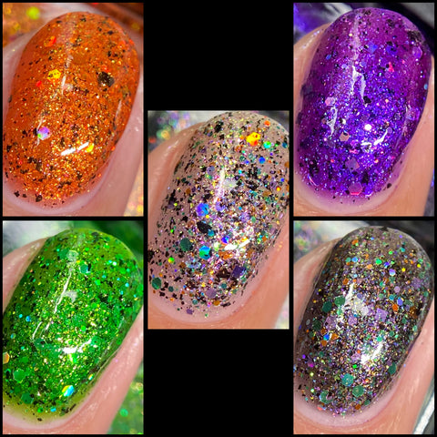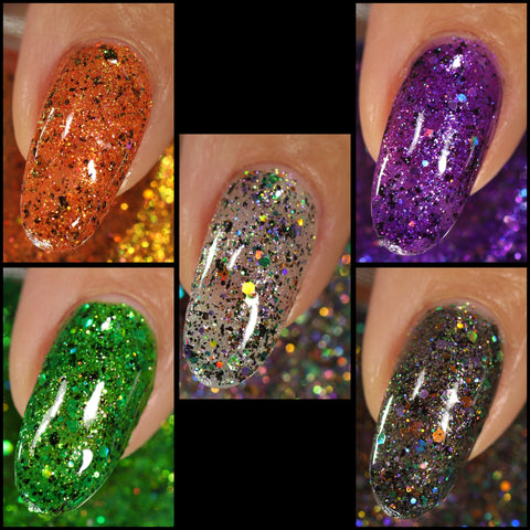 This is Halloween - a clear base filled with 3 different iridescent micro flakie shimmers, black flakes and a blend of various sizes & shapes of purple, green & orange glitters. This one can be worn in one coat as a topper or 2-3 coats on it's own.
