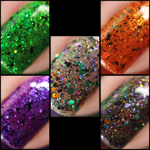 Monster Mash - a black jelly filled with 3 different iridescent micro flakie shimmers, black flakes and a blend of purple, green & orange holo glitters.