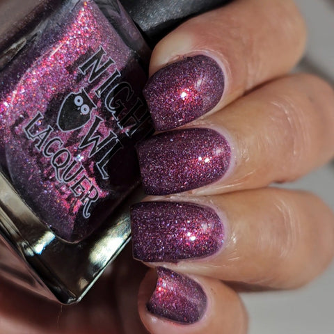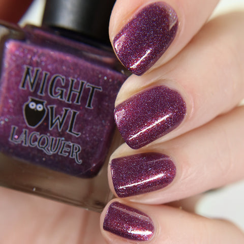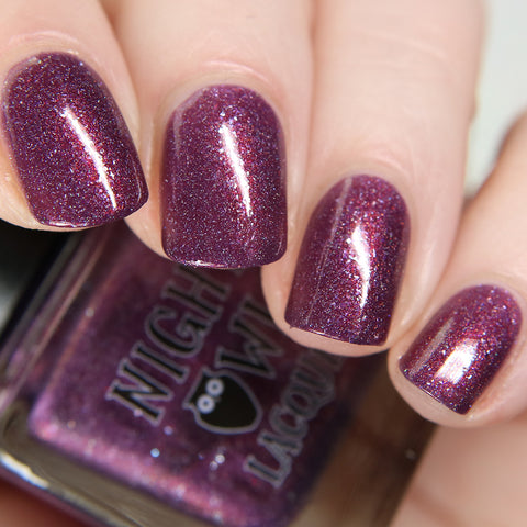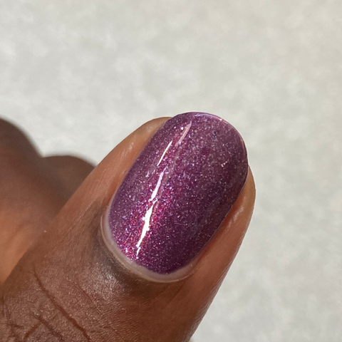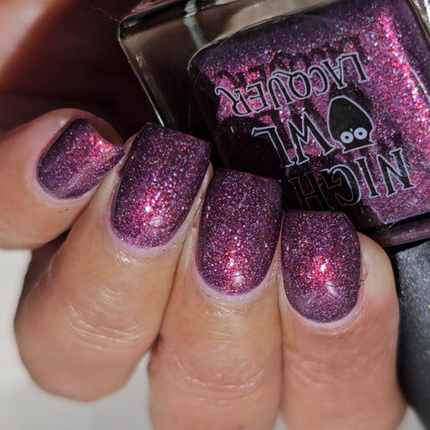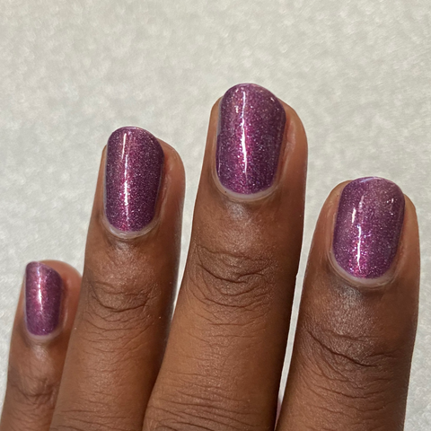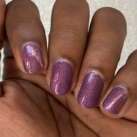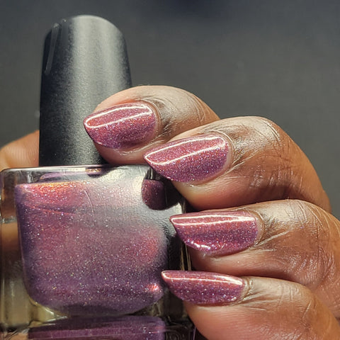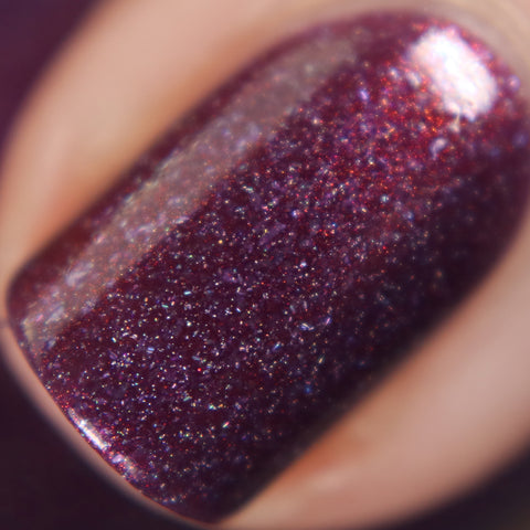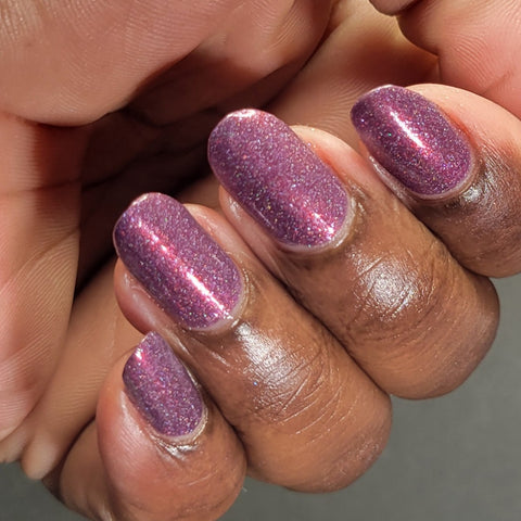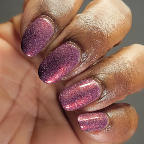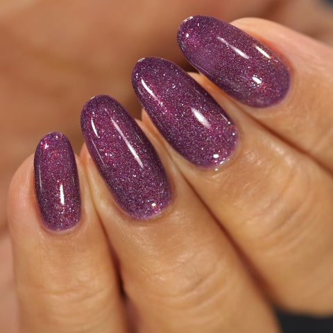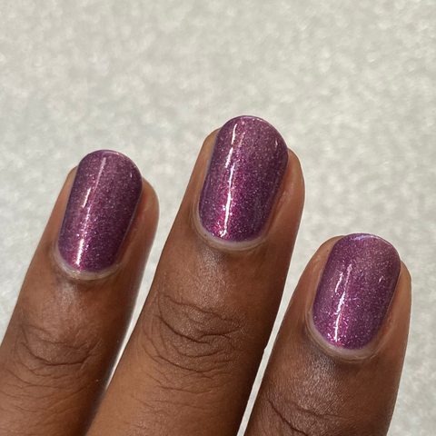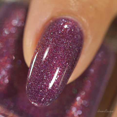 This is a deep dusty plum with red/magenta shimmer, glass flecks and holographic dust.